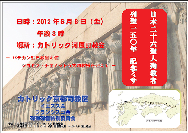 | 2012年4月24日 日本二十六聖人殉教者列聖150周年記念行事のご案内 2012年 カトリック京都教区・広島教区・長崎大司教区 6月 8日(金) [京都教区] 15時 列聖感謝ミサ(於:京都教区カテドラル 河原町教会) 6月 9日(土) [広島教区] 11時30分 列聖感謝ミサ(於:岡山教会) [長崎教区] 14時 講演会(於:長崎カトリックセンター) 15時30分 「日本26聖人記念館」建造記録映画 6月10日(日) [長崎教区] 10時 於:西坂殉教地(長崎) 1.「日本カトリック長崎・西坂巡礼所」の銘板除幕式 2. 椿の木の祝福式 14時 列聖感謝ミサ(於:長崎大司教区カテドラル 浦上教会) |